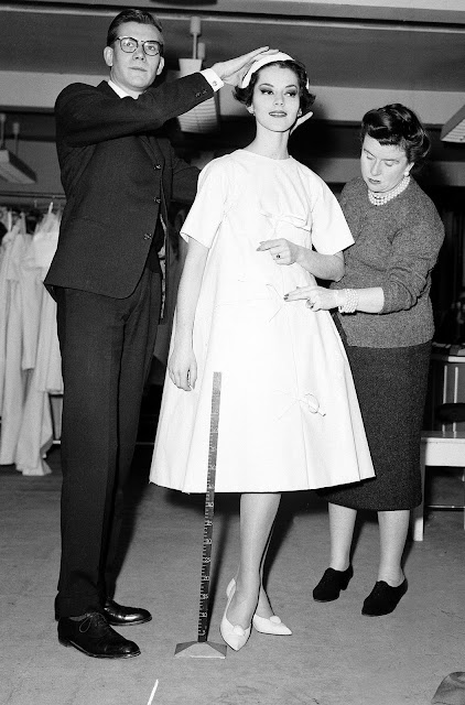 Yves Saint Laurent and an assistant make a few adjustments on one of his trapeze-line dresses, being modeled by Svetlana Lloyd. According to Svetlana, Yves was unbelievably shy.