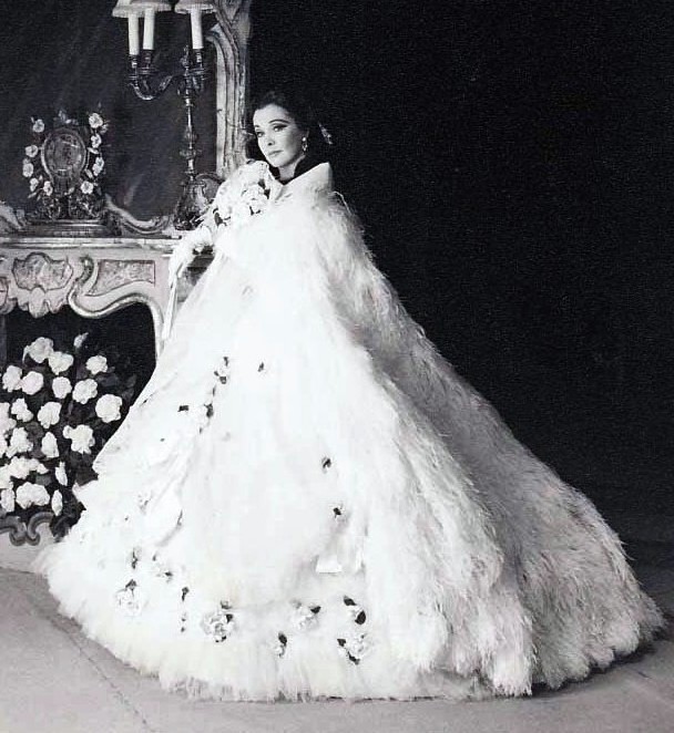 Beneath her opera cape, Vivien wore a hooped, white ball gown. The gown was adorned with ribbon and white camellias. The white flowers meant that Marguerite was ready to receive her gentlemen callers.