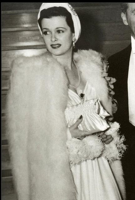 Hedy Lamarr arrived with her husband, Gene Markey, in a long, black wool, evening cape, gorgeously studded with sequins across the shoulders, achieving a capelet effect.