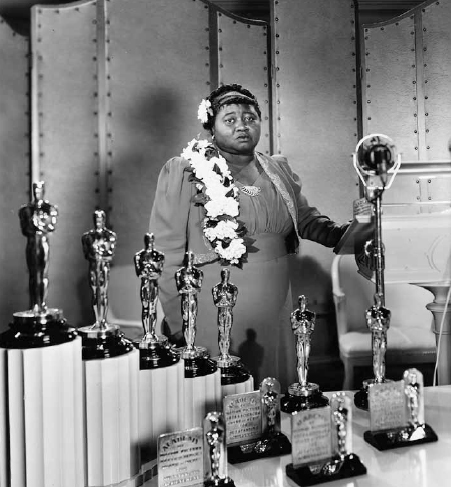 Hattie McDaniel arrived wearing a short fur jacket over her gown, which she highlighted with a gorgeous corsage of gardenias. She chose to wear a blue crepe gown for the night’s festivities, which featured a long-sleeved, cropped jacket over her shirred bodice, with a cummerbund setting off the long skirt. Gardenias and a headband adorned her hair as she took home the Oscar for Best Supporting Actress.