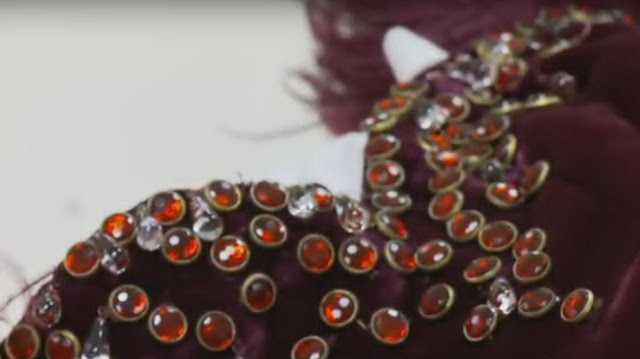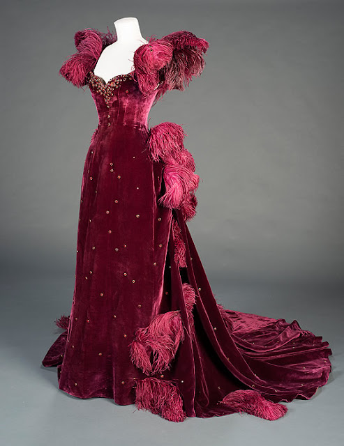 This sleeveless, silk velvet gown is embellished with glass teardrop beads and round, red faceted beads at the neckline and a profusion of ostrich feathers around the shoulders. Rhett’s choice of an ostentatious gown in an immodest burgundy-red color is intended to humiliate Scarlett. -description of dress from the Harry Ransom Center.
