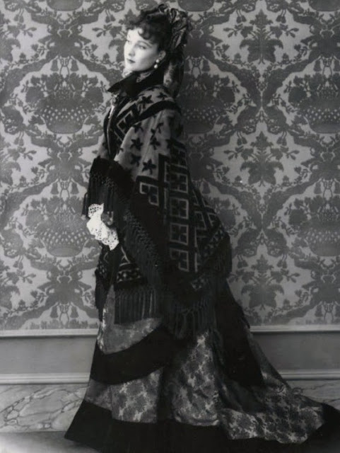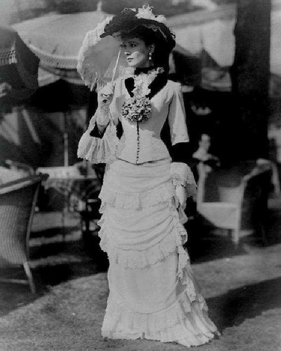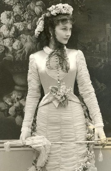 The long-waisted bodice is called a cuirass basque. These were usually boned to mold a woman’s body into a ‘pleasing’ feminine form. I only hope that if Vivien dropped anything on the floor, she had someone nearby to pick it up for her!