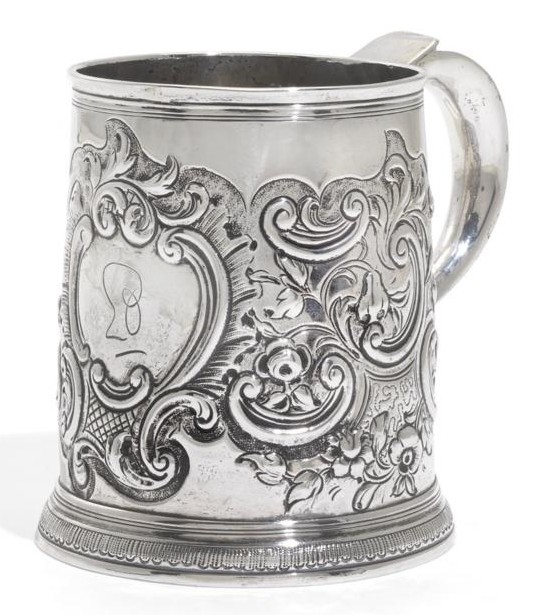 A silver, presentation mug to Laurence Olivier: later embossed and chased with scrolls, flowers and fruits and engraved with initials ‘LO’ and inscription: ’12th June 1947 / from G[?]…’ maker’s mark, London standard and date letter for 1722. The date refers to Olivier’s knighthood and appearance in the Honours List. Sold for £3,000!