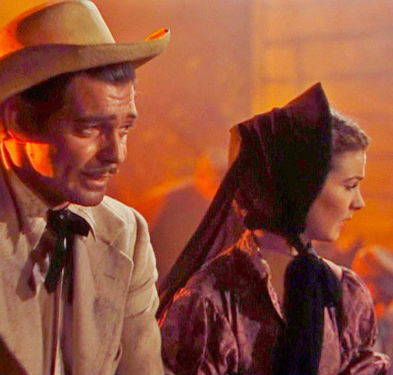 Olivia de Havilland, as Melanie Hamilton, is pictured below wearing her black bonnet. The bonnet, made from black silk, sold for $30,000 at this past weekend’s auction. Melanie wears this hat while she and Scarlett search for Ashley’s name (and thankfully don’t find it) on the recently deceased list handed out to the public. Then later, the bonnet is seen on Scarlett as she’s fleeing a burning Atlanta with Rhett, Melanie, Beau and Prissy.