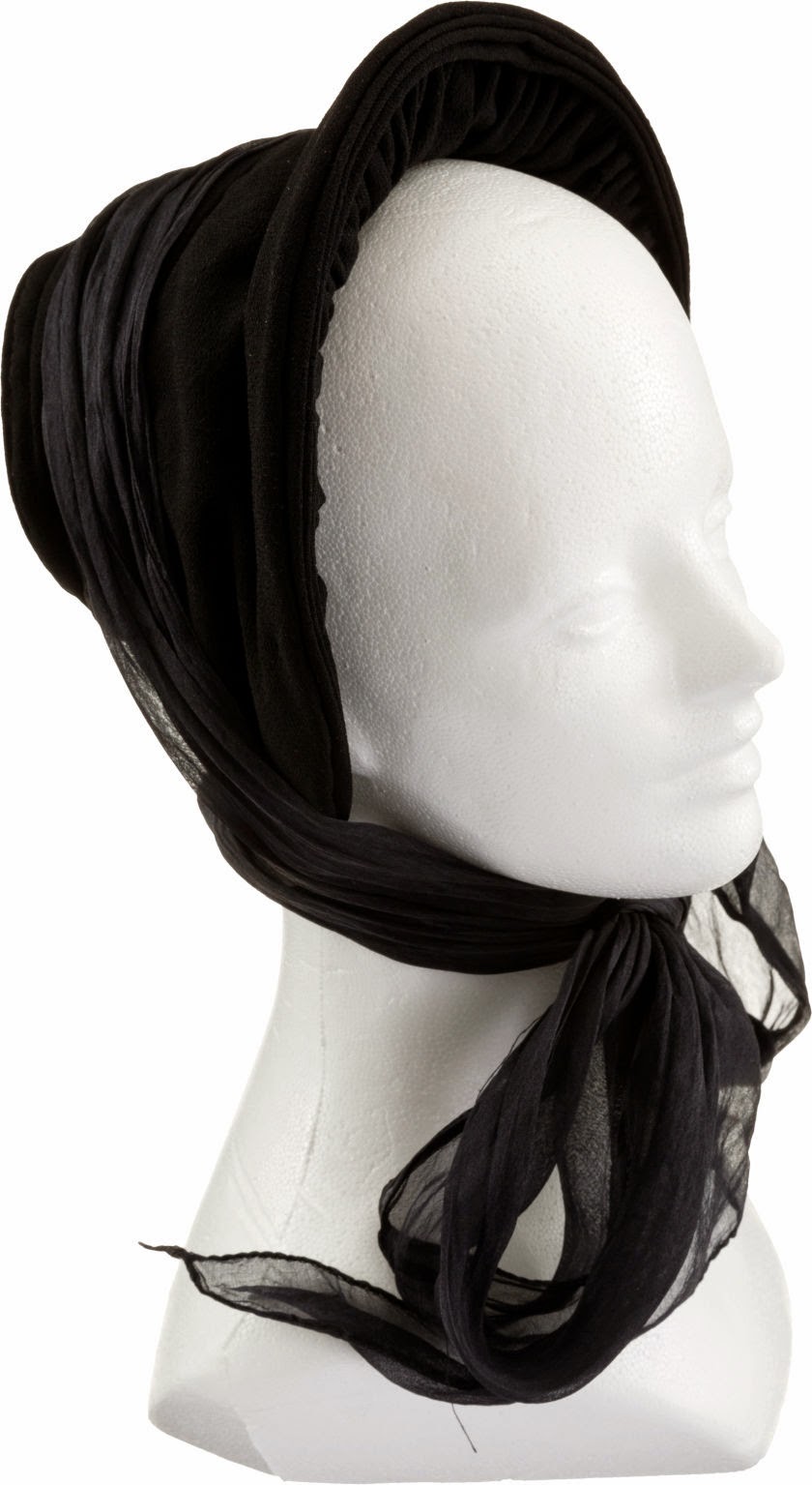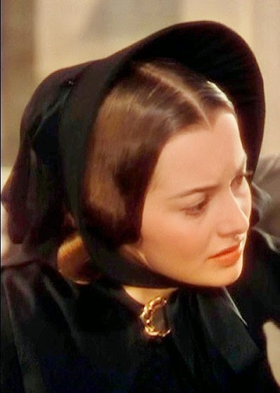 Olivia de Havilland, as Melanie Hamilton, is pictured below wearing her black bonnet. The bonnet, made from black silk, sold for $30,000 at this past weekend’s auction. Melanie wears this hat while she and Scarlett search for Ashley’s name (and thankfully don’t find it) on the recently deceased list handed out to the public. Then later, the bonnet is seen on Scarlett as she’s fleeing a burning Atlanta with Rhett, Melanie, Beau and Prissy.
