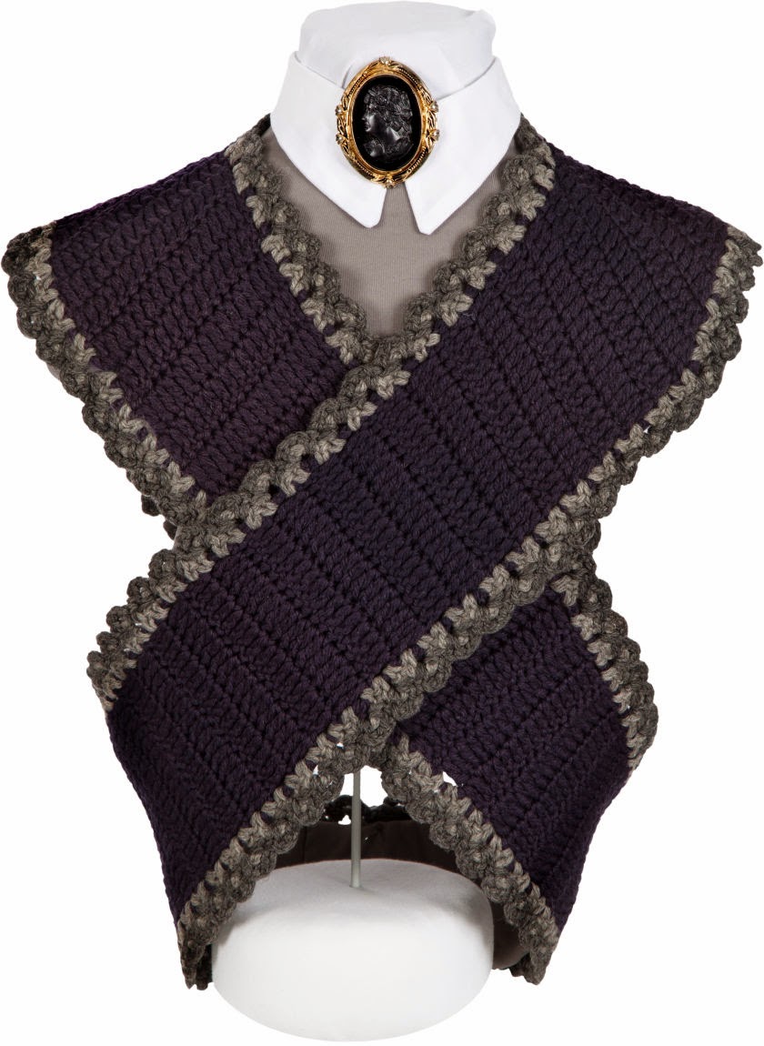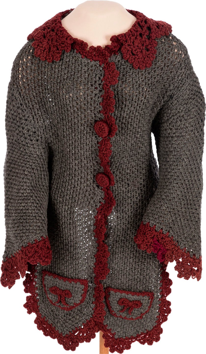 Melanie’s hand-knit sweater sold for $18,750. From the auction’s website: Gray wool with maroon trim at collar, on front, and on cuffs, three-quarter length butterfly sleeves, front portion purposely longer than back of sweater, two small front pockets with maroon wool bow appliqué, two decorative maroon wool buttons on front, hidden snap and hook-and-eye closures.