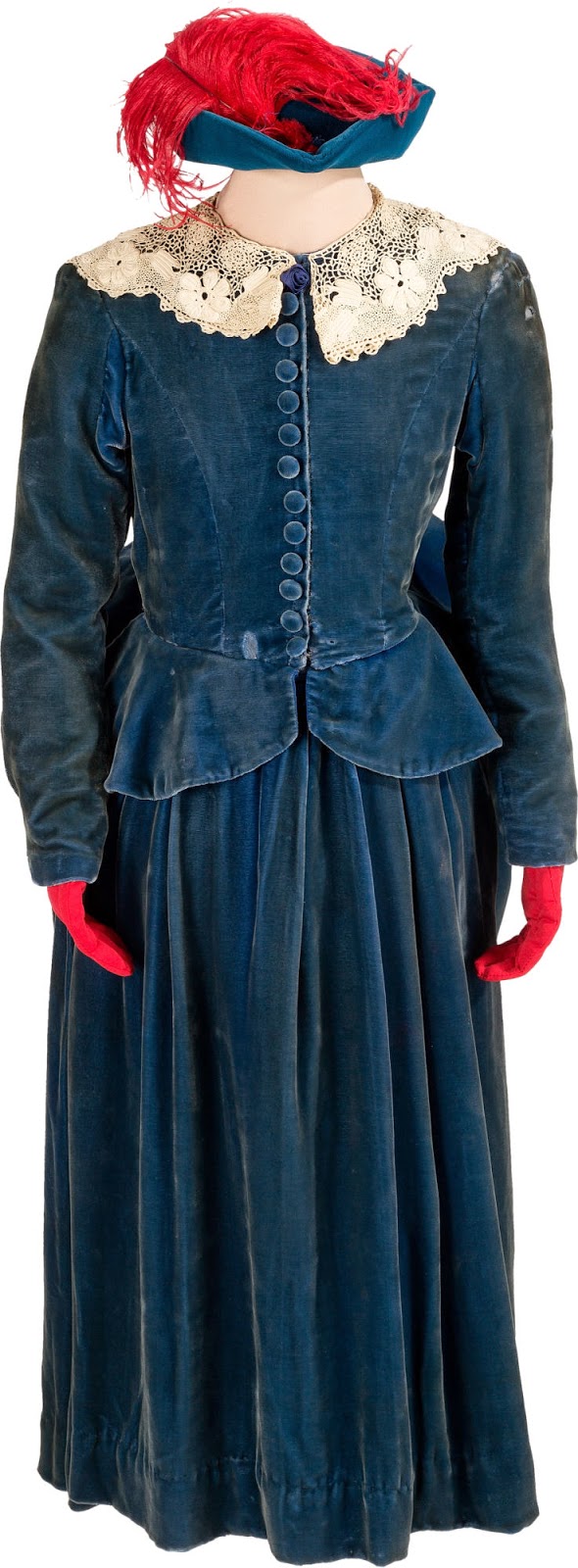 From the auction’s website: Teal blue velvet, long sleeves, 12 button front closure, lace collar, ruffle at front waist, peplum in back, numerous hidden hook-and-eye closures, ‘Selznick Int. Pictures Inc.’ label reads “Bonnie / 108 W.W.-470;” included with a reproduction hat made of similar teal blue velvet and adorned with a red feather.