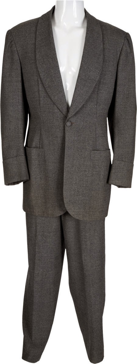 Two pieces; the jacket gray wool, rounded lapels, one button front closure, two front welt pockets, ‘Selznick Int. Pictures Inc.’ label reads “20-108M-140,” costumer’s stamps on both sleeve linings, ‘Eddie Schmidt Inc.’ [tailor to male Hollywood stars] label on lining, further ‘Eddie Schmidt, Inc.’ label reads in part “Clark Gable / 4-25-39 / 3718;” together with matching trousers, five button fly, same ‘Eddie Schmidt, Inc.’ label as jacket, another label evidently removed, numerous costumer’s stamps on waistband lining.