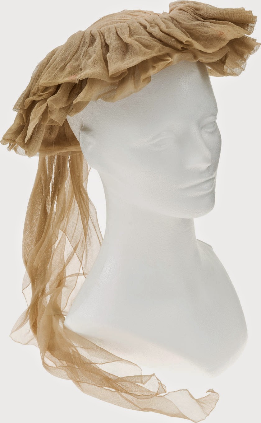 From the auction’s website: Grayish-beige silk, gathered top, ruffled brim, two trailing pieces of fabric at back, ‘Selznick Int. Pictures Inc.’ label reads “Scarlett / 20-108-WW-435,” another label reads “SL 74.153.1…