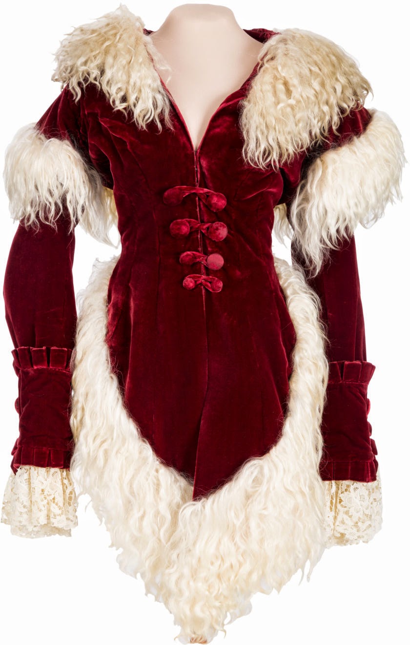 From the auction’s website: Red velvet, ruffled hems, white hair trim at collar, on front hem, and on upper back, white lace trim at cuffs, four button front faux closure, hidden hook-and-eye closures, ‘Western Costume Co.’ label reads “#41;” together with a matching white hair muff, secret pocket inside with a zip-up closure.