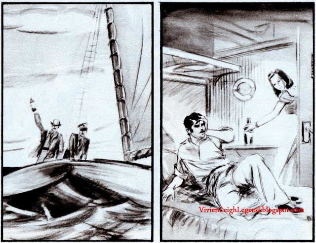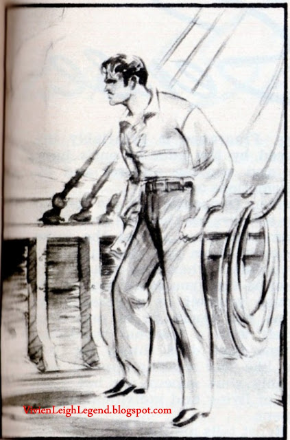 A day out to sea, Rhett wakes up, smashes an empty bottle against the cabin door, yells for a full one. A hand sets the bottle on the table. For a moment he thinks he see Scarlett before him, but convinces himself that the vision is a drunken mind’s hallucination.