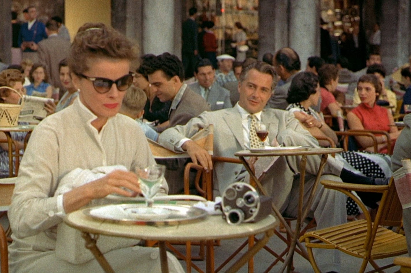Jane ventures out by herself to Piazza San Marco, where she finds herself slightly shocked at the forwardness of some of the young men. It’s here in the Piazza that we have our first glimpse of Renato di Rossi (Rossano Brazzi), an antiques dealer with a shop nearby. She catches him admiring her and becomes embarrassed by his attention. Unnerved, she fumbles for her sunglasses and il conto.