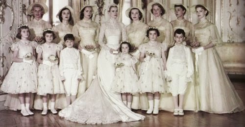 Grace Kelly’s wedding dress was designed by Helen Rose, a costume designer for MGM. Helen Rose had previously designed costumes for Miss Kelly for her movies, High Society and The Swan. Also on hand from MGM’s staff, was hairdresser Virginia Darcy.